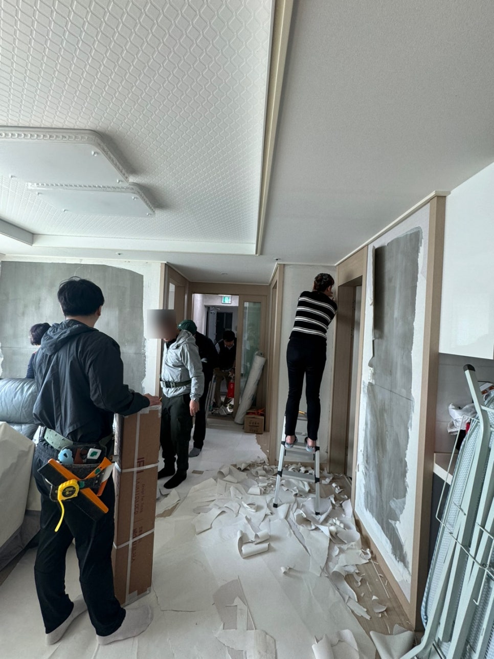 (예; 부직포 전체 제거 및 테두리 남아있는 잔여물 제거 후 다시 부직포 재시공 -> 씽작업 -> 도배 순 )